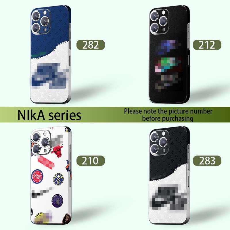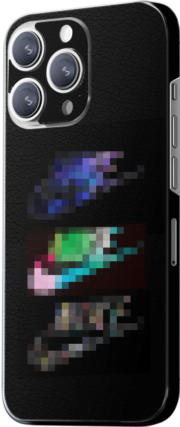 Design 212 (Top Right): The design features three different styles of the Nike logo, set against a black leather background. The overall style is simple yet modern. The primary colors are black with multicolored Nike logos.