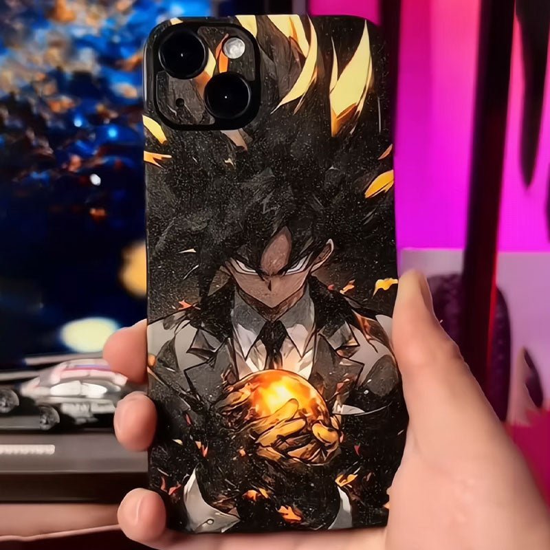 The design showcases an anime character with spiky black hair, dressed in a black suit, white shirt, and black tie, holding a glowing golden sphere in his hands. Surrounding him are fiery effects. The sticker’s primary colors are black and gold, with the glowing golden sphere serving as the focal point, creating a striking contrast with the fiery details.
