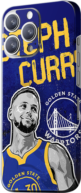 The design showcases Curry in his number 30 Golden State Warriors jersey, with a blue background and bold “Steph Curry” lettering. The yellow and blue of the jersey contrast sharply with the background, making Curry’s iconic image stand out clearly.