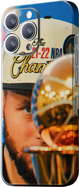 The design depicts Stephen Curry kissing the NBA Championship trophy, with a light blue and gold background that highlights the gleaming trophy. Curry is wearing a championship hat, and the words “2021-22 NBA Champion” appear in the background, emphasizing the sense of honor.