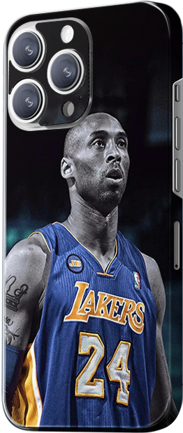 The design features an iconic image of Kobe Bryant, wearing the Los Angeles Lakers’ number 24 jersey, with a focused expression and a determined posture. The jersey is in the Lakers’ signature purple and yellow, and the black-and-white background highlights Kobe’s greatness and strength.