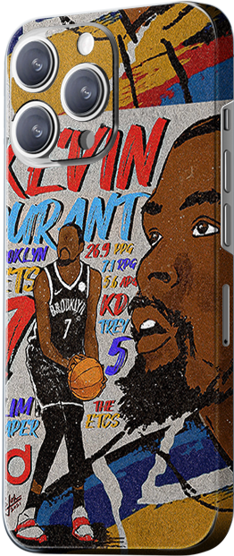 The design shows a comic-style image of Kevin Durant, with a scene of him in the Brooklyn Nets jersey in the background, accompanied by colorful graffiti and text. The overall style is reminiscent of street art, with bright colors, full of personality and energy.