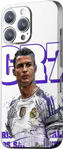 The design features Cristiano Ronaldo in the Real Madrid jersey, with the background displaying his initials “CR7.” The jersey is Real Madrid’s classic white, with purple lettering in the background. The design is simple yet powerful.