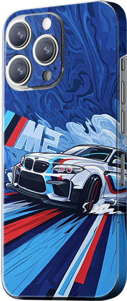 The design features a white BMW race car with the classic red, blue, and light blue racing stripes of the M series. The car is depicted speeding through clouds, showcasing the blend of speed and power. The design uses a background of blue sky and white clouds, creating a sense of flying, with a bold and sporty color combination.