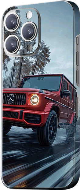 The design shows a red Mercedes G-Class off-road vehicle speeding through snow, with the tires kicking up snowflakes. The background is a cold winter landscape, emphasizing the vehicle’s powerful off-road capabilities. The red body stands out against the white snow, and the design is dynamic, highlighting the strength and adventurous spirit of the Mercedes off-roader.