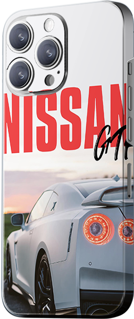 The design features a white Nissan GT-R sports car, viewed from the rear, with a background of a sunset sky. The bold “NISSAN GT-R” text is prominently displayed above the car. The primary colors are white and red, with the car reflecting the colors of the sky, giving the design a sense of speed and high-performance appeal.