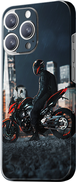 The design depicts a motorcycle and rider in a city night scene, with the motorcycle’s dynamic design suggesting adventure and excitement. The main colors are black and orange, giving a sense of adventure and freedom.