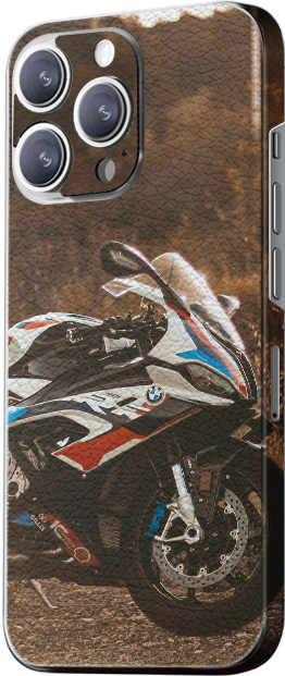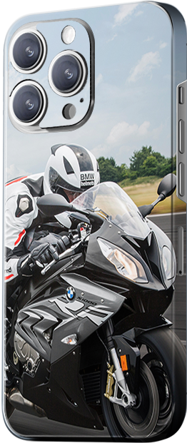 This design features a motorcycle rider cruising down an open road, with the bike and rider exuding a sense of motion. The primary colors are white and black, set against a natural backdrop that combines freedom and speed.