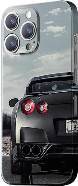 The design displays a black sports car viewed from the rear, with a background of blue skies and open roads, emphasizing the car’s speed and strength. The primary colors are black and gray, offering a clean and luxurious aesthetic, perfect for fans of high-end cars.