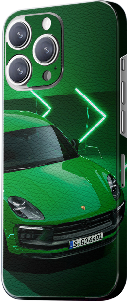 The design showcases a green sports car with bright green arrows above the hood, giving a tech-savvy vibe. The primary colors are green and black, with a glossy finish that emphasizes modernity and movement.