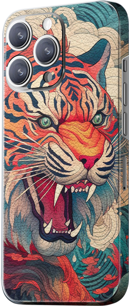 The design shows a roaring tiger with waves and patterns in the background, representing wildness and bravery. The main colors are orange, green, and blue, creating a bold and powerful impression.