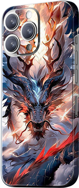 This design portrays a fierce fire dragon, with flames and clouds in the background, symbolizing strength and power. The primary colors are red, blue, and gray, giving it a dynamic and fantasy-inspired aesthetic.