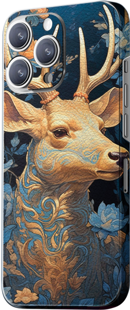 This design presents an elegant deer with intricate floral patterns, set against a deep blue forest backdrop. The primary colors are gold and blue, offering a dreamy and majestic feel.