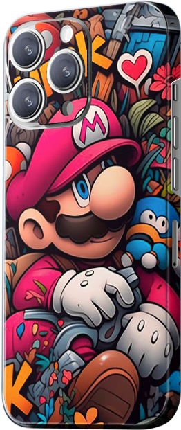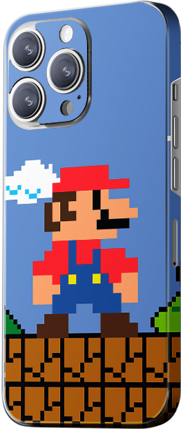 This design shows a pixelated Mario, with a background of classic Mario game scenes, evoking a retro gaming feel. The main colors are blue, red, and green, great for lovers of vintage video games.
