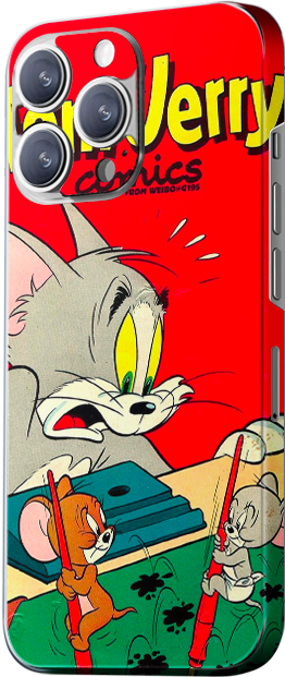 The design depicts a classic chase scene from Tom and Jerry, with a red background. Tom and Jerry’s interaction is full of action and humor. The main colors are red, yellow, and gray, suited for fans of comedic cartoons.