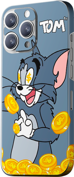 This design features Tom the cat from Tom and Jerry, holding gold coins, with a gray background. Tom’s expression is smug, making the design playful. The main colors are gray, yellow, and blue, perfect for fans of Tom and Jerry.