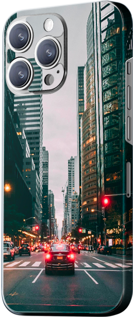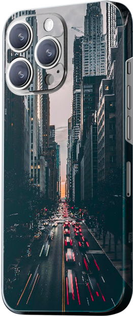 1267 (Bottom Right): The design captures a city street at dusk, with towering buildings reflecting the warm sunset, as cars move along the road, and lights begin to shine. The primary colors are dark blue, gray, and orange, evoking a sense of urban dynamism and warmth.