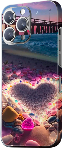 1296 (Bottom Left): The design depicts a heart shape made from colorful pebbles on a sandy beach, with a serene ocean view in the distance. The primary colors are purple, pink, and blue, creating a romantic and tranquil atmosphere, perfect for nature lovers.