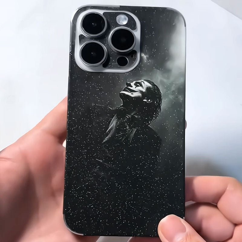 The phone skin sticker primarily features a black-and-white color scheme, depicting a clown looking up and laughing. The clown’s facial details and expression are very vivid, while the background seems to have smoke or mist, adding a sense of mystery and drama. The image is also adorned with speckled effects, resembling stars or snowflakes, enhancing the visual depth of the design. Overall, the design has a dark and profound tone, creating a strong emotional atmosphere.