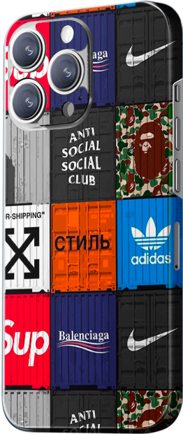 This design showcases a patchwork of logos from various fashion brands, including Nike, Adidas, and Supreme. The overall style is trendy and contemporary. The primary colors are red, gray, and black.