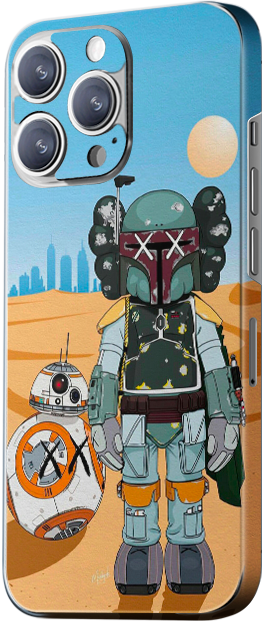 This design merges KAWS figures with “Star Wars” characters, set against a desert landscape. The style blends science fiction with art. The primary colors are blue and brown.