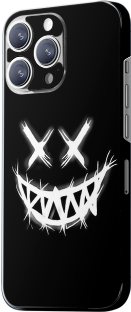 The design features a smiley face with exaggerated teeth on a black background. The style is eerie and rebellious. The primary colors are black and white.