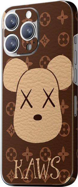 The design features the head of a KAWS figure against a brown and beige background with luxury brand patterns. The style is simple and textured. The primary colors are brown and beige.