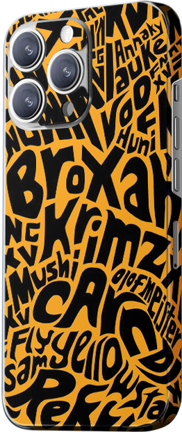 1523 (Top Left): The graffiti-style design consists of bold letters and symbols in yellow, set against a black background. The design is dynamic and full of creative energy, with yellow and black as the dominant colors.