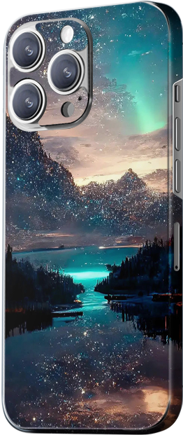 1496 (Top Left): The design shows a peaceful lake with distant snow-covered mountains under a starry night sky. The reflection on the water adds to the serene and dreamy atmosphere. The main colors are blue and white.