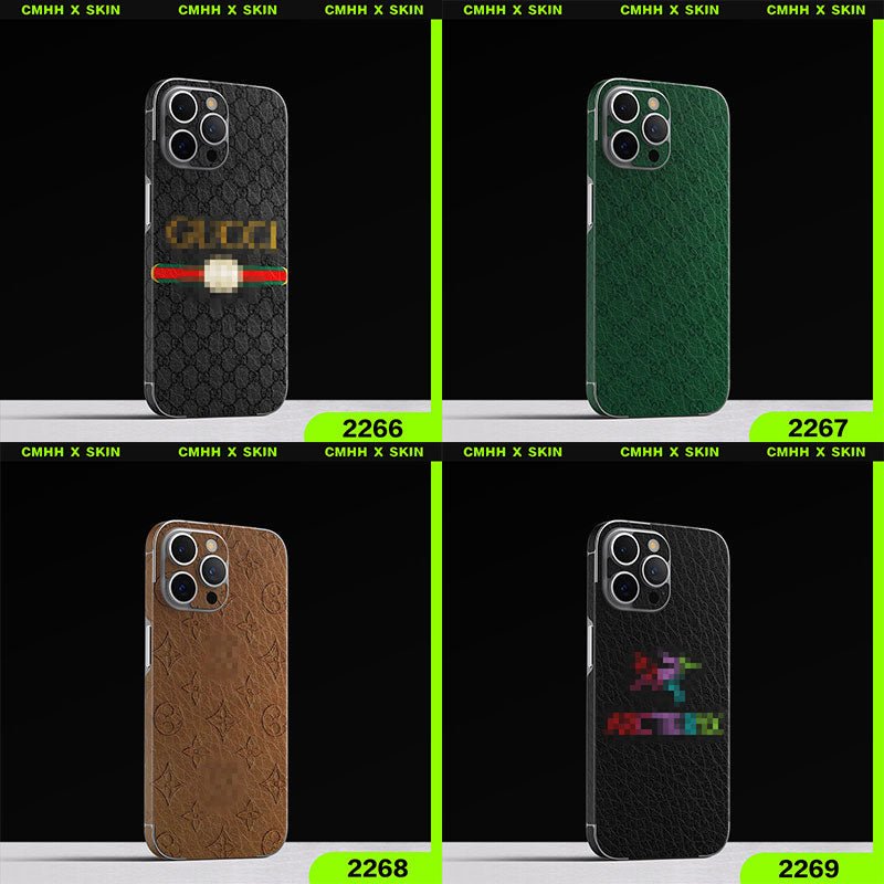 Design 2266 (Top Left): Featuring the iconic Gucci embossed pattern on a black background, this design includes a gold Gucci logo at the center, offering a simple yet luxurious look. The primary colors are black and gold.