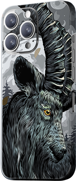 The design showcases a black goat with long horns, set against a gray background with a moon and trees, giving off a mysterious vibe. The primary colors are black and gray, delivering a cool and mystical style.