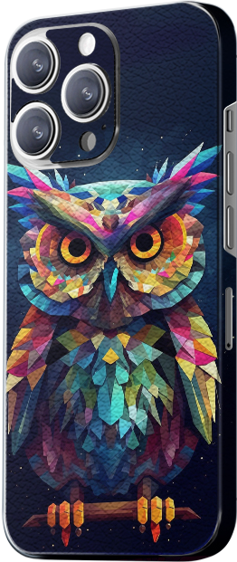 The design features a colorful owl with vibrant feathers, perched on a branch, against a dark blue night sky. The primary colors include purple, blue, yellow, and red, offering a lively and mysterious feel.