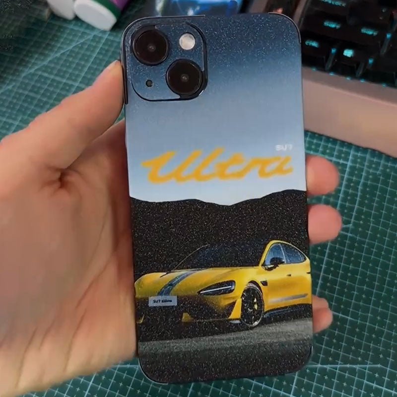 The phone skin showcases a design themed around scenery and a sports car. The upper part depicts a gradient blue sky, resembling a dusk or dawn atmosphere, with the yellow text “Ultra” printed on it. The lower part features a yellow sports car parked on a black road, creating a visual impression of speed and modernity.
